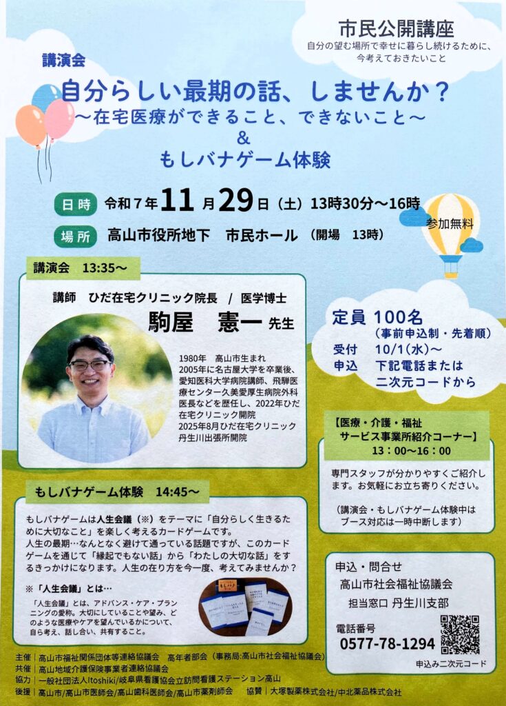市民公開講座で講演を行いました 2025/11/29 お知らせ 高山市で開催された市民公開講座において、「自分らしい最期の話、しませんか? ~在宅医療ができること、できないこと~」 をテーマに講演を行いました。