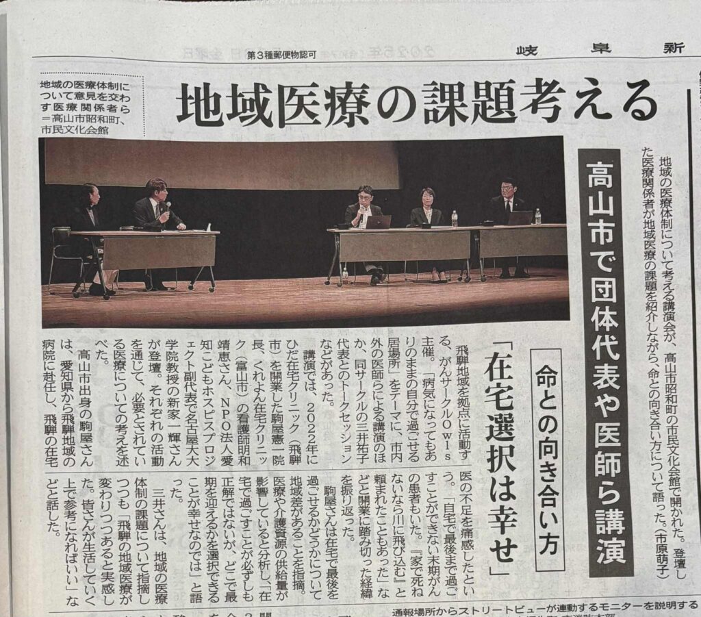 がんサークルOwls代表 三井祐子さん、高山市議会議員 益田大輔先生、愛知こどもホスピス副代表 新家一輝先生、くれよん在宅クリニック看護師 明和靖恵さん による、講演とトークセッションが行われました。